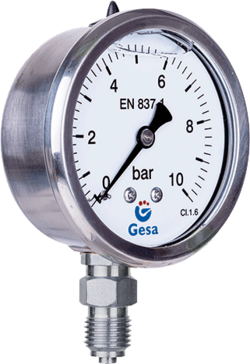 Manómetro M0305 con caja y rosca de acero inoxidable. Cierre mediante aro sellado y relleno de glicerina. Clase 1.6