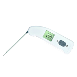 El termómetro Thermapen IR combina dos instrumentos en uno: un termómetro infrarrojo sin contacto y un termómetro con sonda plegable, ideal para medir temperaturas de superficie y internas en cocinas y aplicaciones industriales. Simplemente hay que apuntar al objetivo y pulsar el botón para visualizar la temperatura sobre un rango entre -49.9 a +349.9ºC con una resolución de 0.1ºC.
