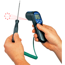 The RayTemp® 8 Infrared Thermometer with probe socket is a professional IR thermometer that incorporates a 12:1 optic ratio (target distance/diameter ratio), this enables users to measure small targets from a distance. The user stands a safe and comfortable distance from the target, points the thermometer at the surface to be measured, presses the button and instantly reads the temperature. Ideal for measuring the temperature of ceiling vents and hot pipes in the HVAC industry or any other item that is difficult to reach. This enables the user to measure most surfaces accurately and quickly. The holder screws into the bottom of the thermometer's housing, allowing the unit to be mounted onto a metal surface for continuous monitoring.