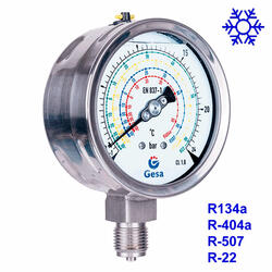 Description: Measures pressure of R22, R134a, R404a, R507. For refrigeration systems. Stainless steel case. Bayonet closure. Suits low-viscosity fluids not corroding copper alloys. Handles vibrations and rapid pressure changes. Filled with glycerin. Includes overpressure relief system.