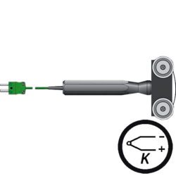 This roller surface probe is specially designed for measuring moving surfaces. Response time is less than 0.5 of a second and the maximum speed it withstands is 100 meters per minute. The wheels can be made in PTFE or in stainless steel.