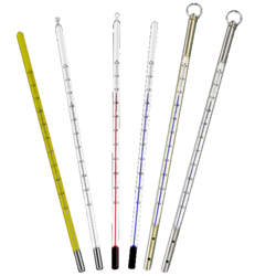 Termómetro de varilla de vidrio y depósito de mercurio para altas temperaturas, se fabrica también con alcohol azul o rojo para temperaturas menos extremas.