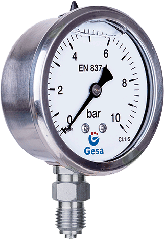 Manómetro M0305 con caja y rosca de acero inoxidable. Cierre mediante aro sellado y relleno de glicerina. Clase 1.6
