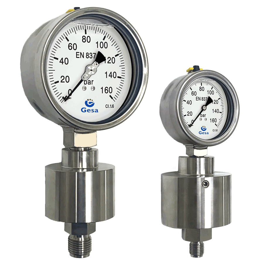 Manómetro con separador de membrana en acero inoxidable AISI 316 para fluidos de alta viscosidad o corrosivos. Especialmente indicados para condiciones de uso difíciles debido a la existencia de vibraciones o cambios rápidos de presión. Útiles en ambientes agresivos, sistemas de refrigeración y amoniaco.