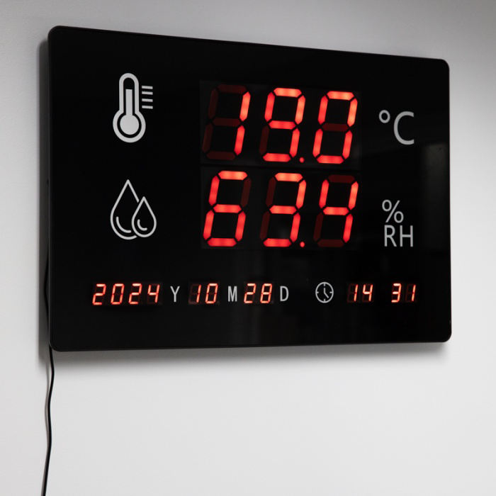 Termohigrómetro digital de gran formato diseñado para entornos interiores, ideal para monitorear temperatura y humedad en espacios regulados. Su pantalla LED de alta visibilidad ofrece lecturas claras y precisas, perfecta para entornos donde la fiabilidad y la legibilidad son esenciales.