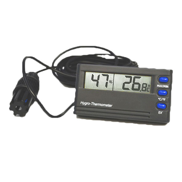 El termohigrómetro digital mide y muestra simultáneamente la humedad relativa y la temperatura. Registra los valores máximos y mínimos para un control preciso. Equipado con un sensor interno que cubre temperaturas de 0 a 49,9 °C, incluye una sonda externa con un cable de 3 metros que mide temperaturas de -49,9 a 69,9 °C y humedad relativa de 20 a 98 %.