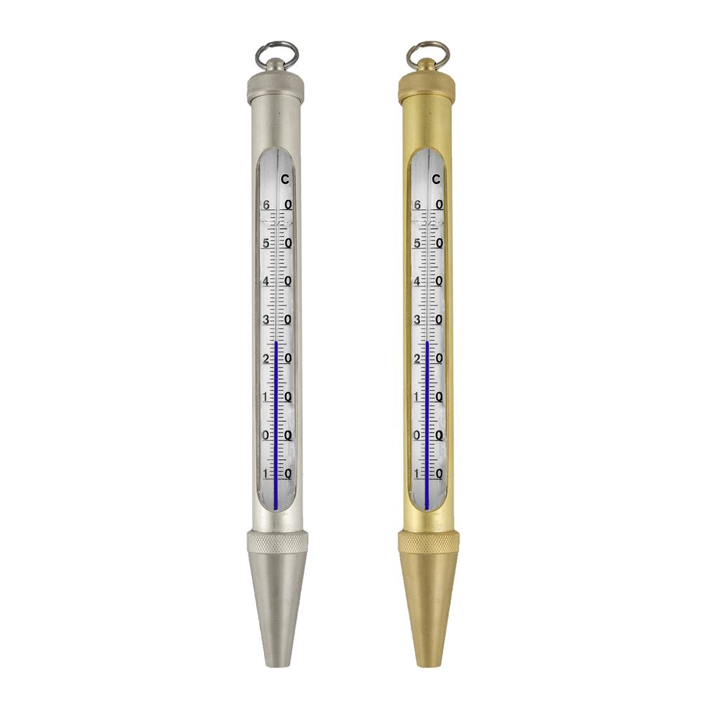 Glasthermometer geschützt durch Messinghülse mit Aufhängering.