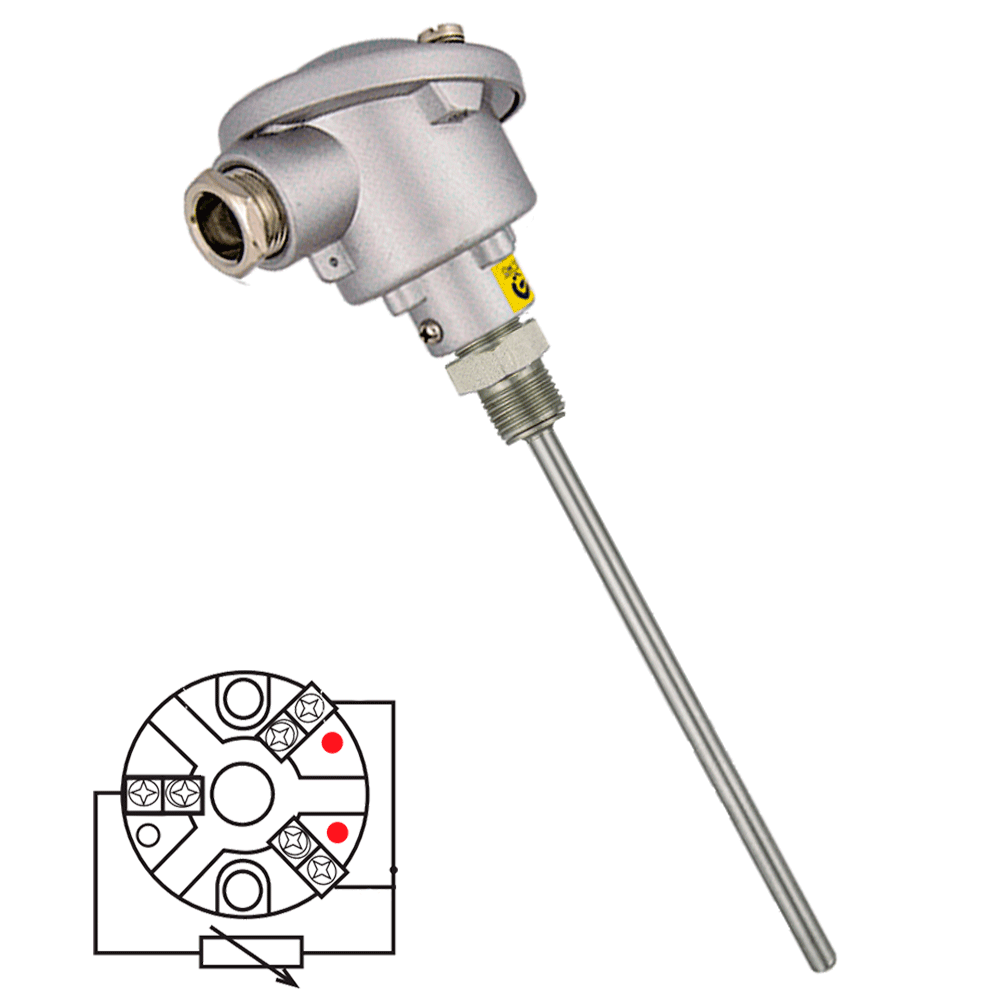 Temperatursensor PT100 mit Kopf mit elektrischen Anschluss und Edelstahlschaft.