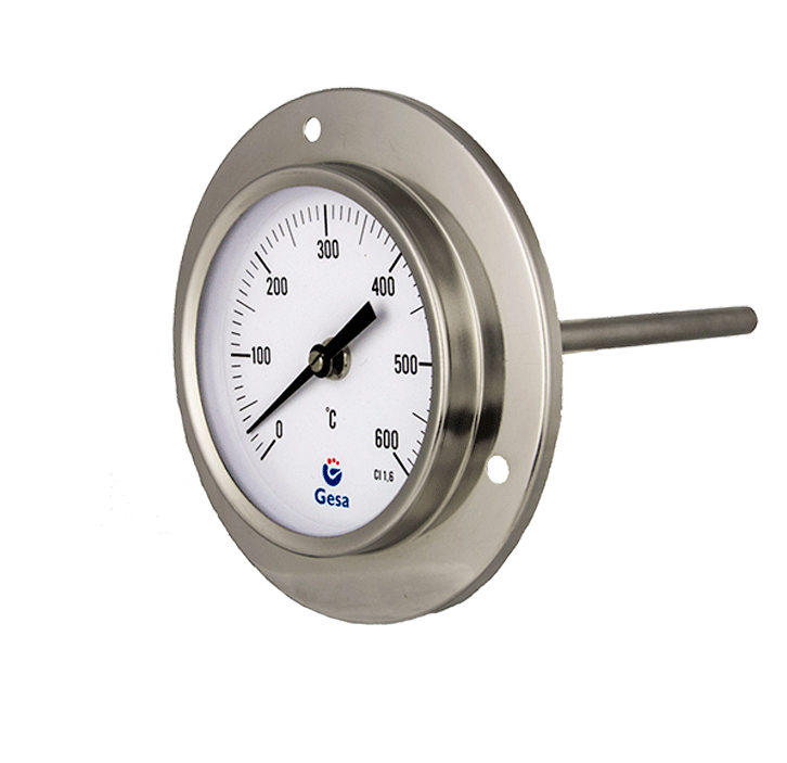 Bimetallic oven thermometers with front flange D41 are specifically designed for use in ovens of any size, with a particular focus on installation in the mouth of large ovens. They feature a front flange connection, making them ideal for panel mounting. Constructed with a case and stem made of AISI 304 stainless steel, and internal components of copper alloy, these thermometers offer high resistance and reliability in high-temperature environments. With a temperature range of 0 to 600 °C and an IP56 protection rating, they ensure durability and accuracy, though they should not be exposed directly to fire.