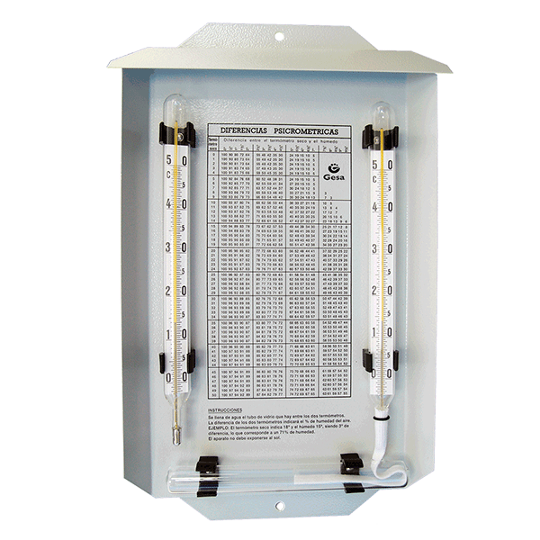 Pour l'humidité relative, la tension de vapeur et les points de rosée sont déterminées à l'aide d'un psychromètre. Ce dispositif est constitué d'un ensemble de deux thermomètres égales: l'un d'eux, appelé "thermomètre sec", qui sert simplement pour obtenir la température de l'air, et l'autre, appelé "thermomètre humide", qui dispose d'un réservoir recouvert d'une humide mousseline et un réservoir d'eau distillée relié par l'intermédiaire d'une mèche.