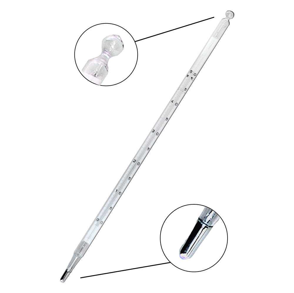 A escala de temperatura está impressa em uma placa de opala dentro do termômetro para que seja totalmente resistente a ácidos e álcalis.