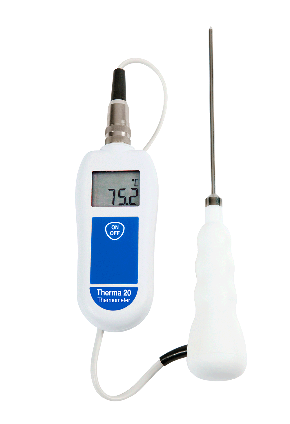 O Therma 20 é um termômetro digital portátil projetado especificamente para uso diário em hospitalidade, cozinhas e processos industriais de alimentos. Ele mede temperaturas de -39,9 °C a +149,9 °C com uma resolução de 0,1 °C e uma precisão de ±0,4 °C na faixa de -25 a 110 °C (±1 °C para o restante). Sua eletrônica avançada garante uma precisão do sistema de ±0,5 °C por toda a vida útil.