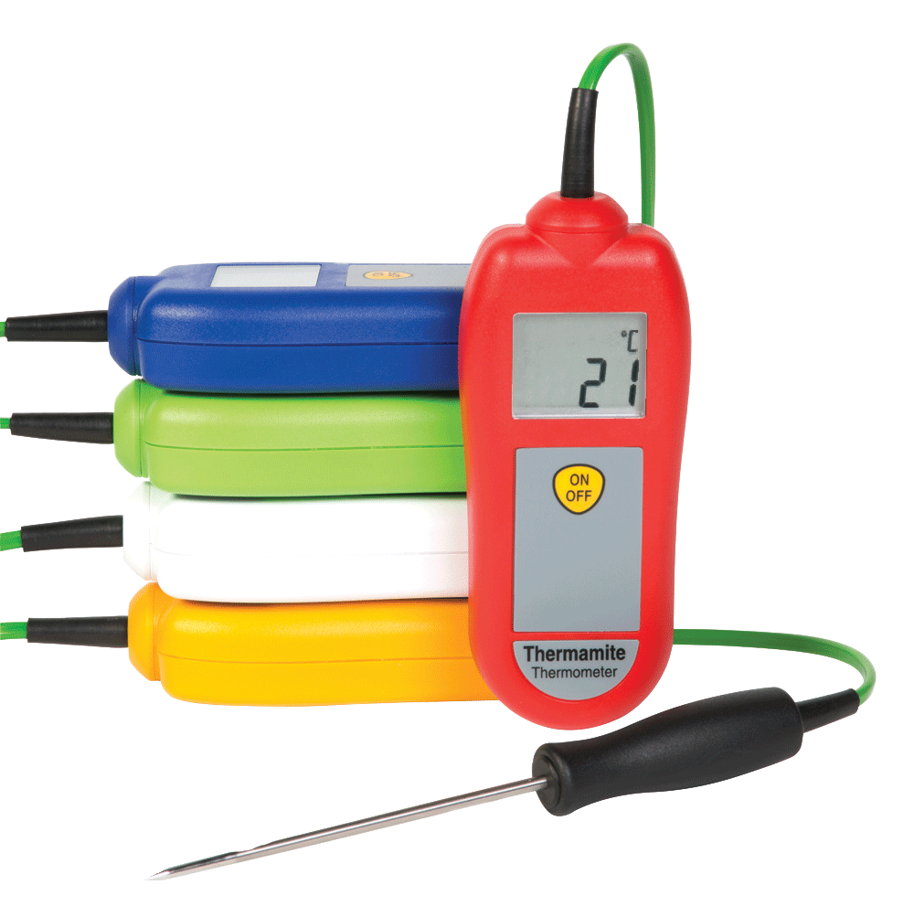 O termômetro Thermamite destaca-se pela sua precisão, confiabilidade e facilidade de uso, projetado para aplicações versáteis. Opera numa faixa de temperatura de -49,9 a 300°C com uma resolução de 1°C. É ideal para verificações diárias de segurança alimentar em ambientes como cozinhas, hotelaria e processamento de carne. Possui uma sonda de penetração fixa de aço inoxidável (Ø3,3 x 108 mm) conectada por um cabo de 500 mm. Sua tela LCD de 12 mm garante leituras claras e precisas. Alimentado por três baterias AAA de 1,5 volt, tem uma vida útil estimada de 10.000 horas. Além disso, inclui proteção Biomaster contra micróbios e resistência à água e poeira classificada como IP65 (com tampa opcional). Acessórios adicionais, disponíveis separadamente, complementam sua funcionalidade.